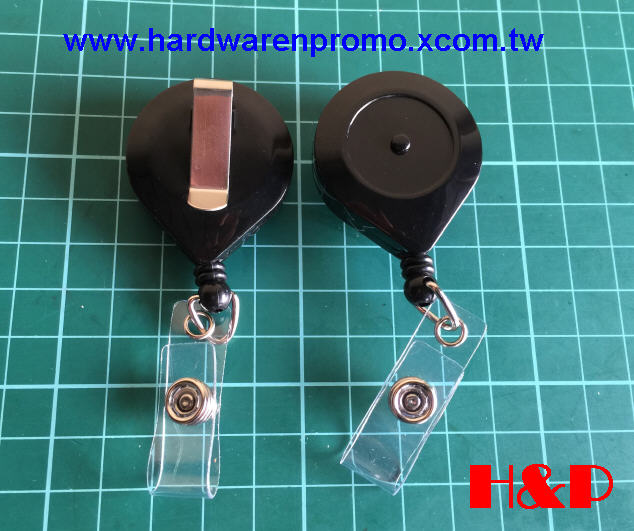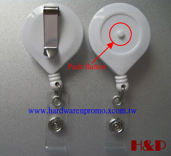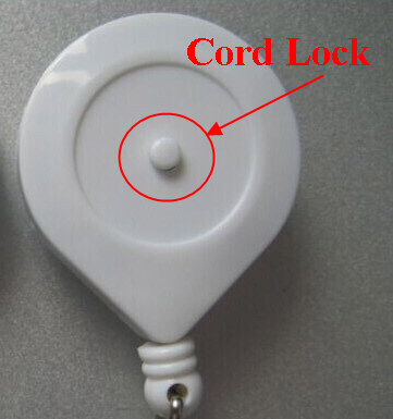 - Attachments: Belt Clip (on back), Nylon Cord, ID Strap (different end attachment available on request), Locking Button on reel center (the cord retracts ONLY when the button is pressed!)